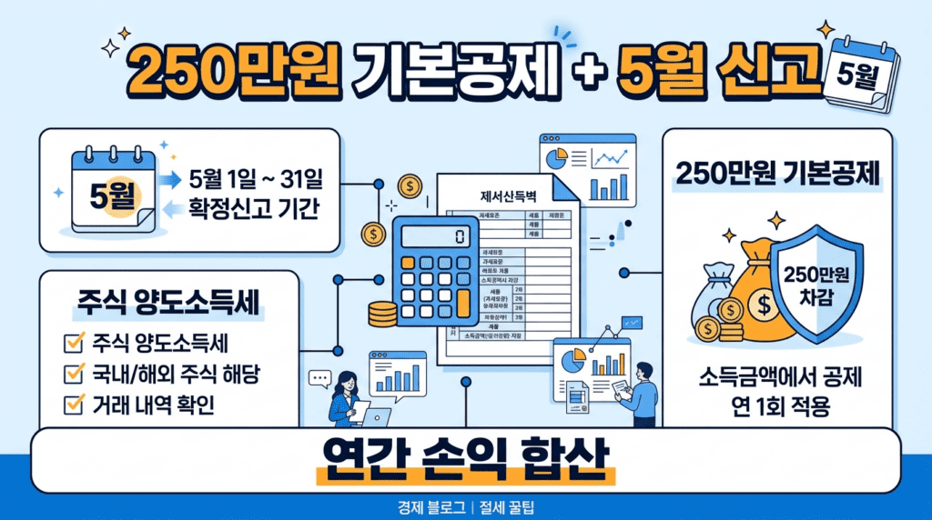 초보자 기준으로는 250만원 기본공제와 5월 신고 시기를 먼저 기억하는 것이 좋습니다.