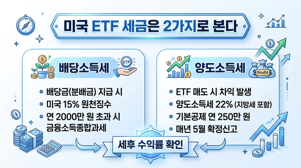 가장 먼저 이해해야 할 것은 미국 ETF 세금이 한 가지가 아니라는 점입니다. 많은 초보 투자자가 “미국 ETF는 세금이 얼마냐”를 한 줄로 알고 싶어 하지만, 실제로는 배당을 받을 때의 세금과 매도해서 차익이 날 때의 세금이 다릅니다.