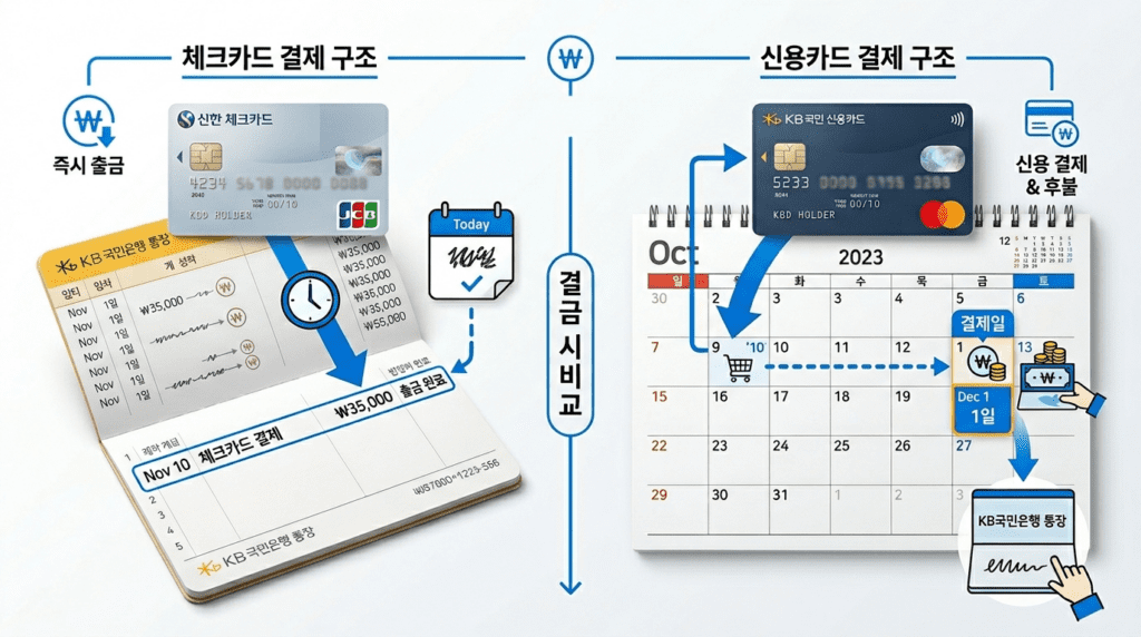 가장 큰 차이는 결제 시점입니다. 신용카드는 나중에 결제일에 청구되고, 체크카드는 결제 즉시 통장에서 돈이 빠져나갑니다.
